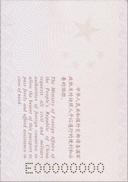 中华人民共和国外交部请各国军政机关对持照人予以通行的便利和必要的协助。