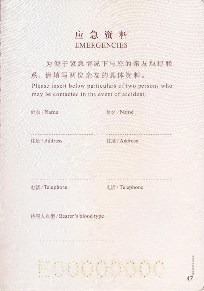 护照的第47页是“应急资料”页面。这个页面是留给你自己填写的,内容是紧急联系人的信息。