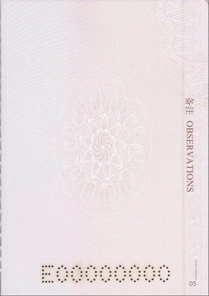 封三页就是封底背面的那一页,封底为纯色背景无任何内容我们不做介绍。封三页的内容特别重要,这一版护照是电子护照,在封三页和封底页中埋入了电子芯片和线圈,如果打孔或者弯折以及暴露在极端温湿度环境中,都有可能对芯片造成破坏,因此,平时在使用和保管的过程中要十分注意。小彩蛋来了,当护照因一些原因被宣布作废后,相关工作人员也会对封三页进行剪角处理,这样就破坏了芯片,也代表这本护照已经无效。