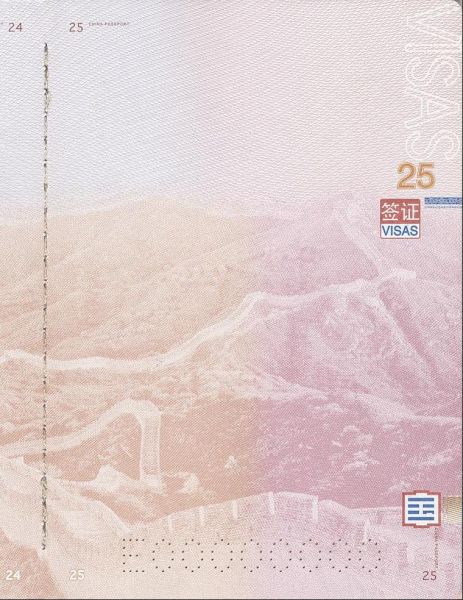每一页签证页上都印着一幅中国风景图案,长城、故宫、泰山、黄河壶口瀑布、桂林漓江、苏州园林、敦煌莫高窟、布达拉宫……这些图案精美细致,既是装饰,也有防伪功能。在紫外灯下,这些图案会呈现出不同的效果,这是护照防伪的重要手段之一。